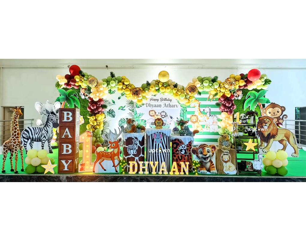 Transform your party into a magical jungle safari with this vibrant and immersive jungle-themed balloon decoration setup, specially designed to celebrate little Dhyaan Atharv’s birthday in style!