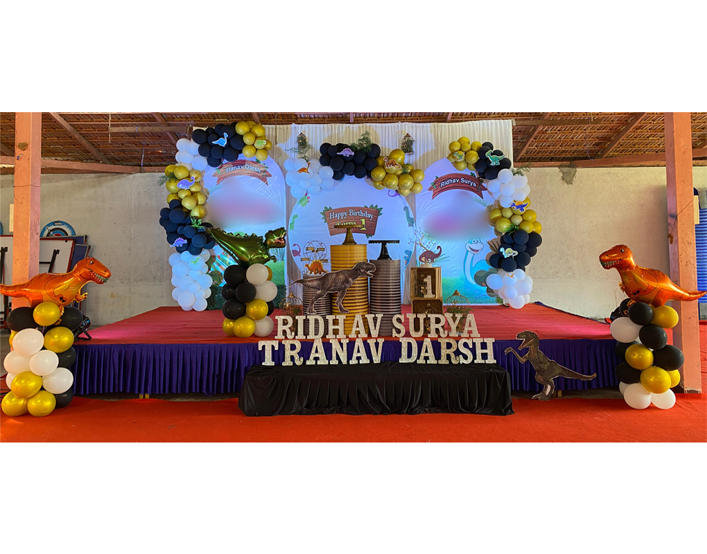 Step back into the Jurassic era with this grand and exciting dinosaur-themed balloon decoration, designed to celebrate the birthdays of Ridhav, Surya, Tranav, and Darsh! This stage transforms into a prehistoric world filled with fun, adventure, and dino-mania — perfect for multiple birthday celebrations with bold themes.